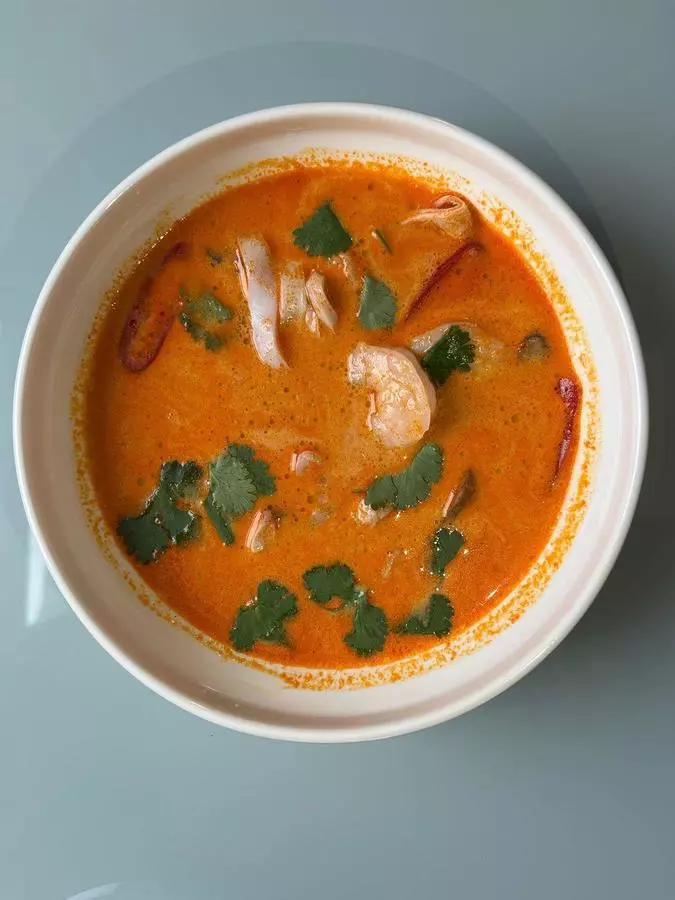Бульон том ям, креветки тигровые, кальмар, грибы шиитаке, рис, зелень, перец чили.