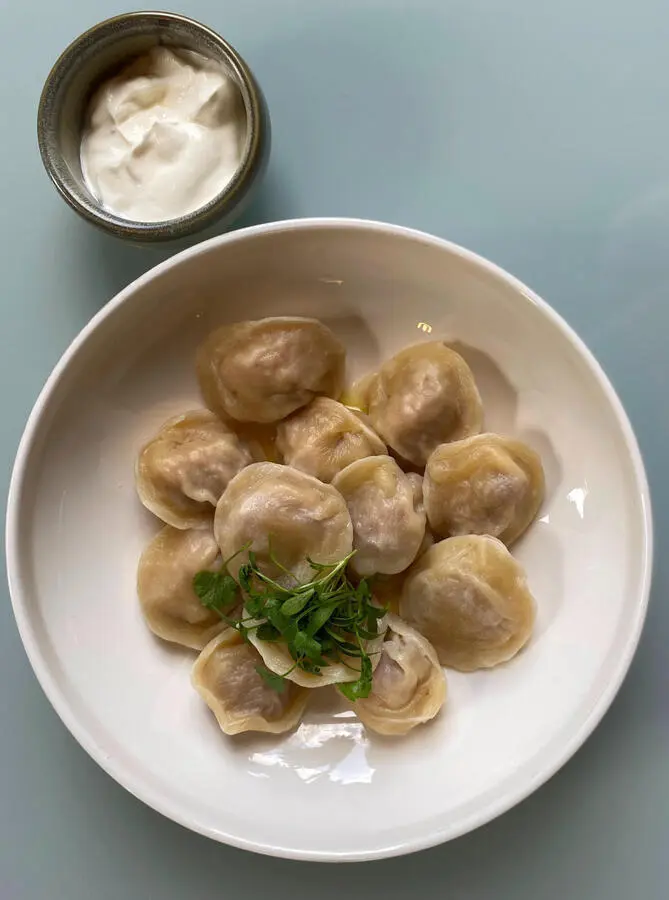Нежнейшее тесто, фарш свинина, говядина, луковый фреш, соль, специи. Подаются со сметаной.